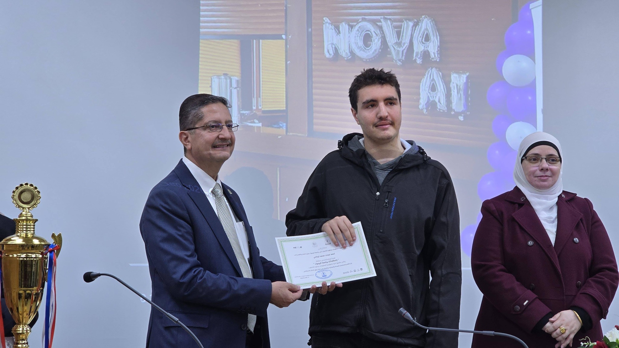وفي كلمته الختامية ثمن عميد الكلية جهود جميع المشاركين والفرق المتنافسة والجهات الداعمة ولجنة التحكيم، واشاد بالمستوى المميز من الإبداع والابتكار الذي تم تقديمه في المسابقة. وقدم الشكر للجنة التحكيم ولكل من ساهم في إنجاح هذه الفعالية. وأشار انه سيكون هناك المزيد من المبادرات التي تدعم الإبداع التقني وتعزز من دور الشباب في مجال الذكاء الاصطناعي والتكنولوجيا. وكما أشار العميد بانه سيتم تقديم التطبيق الفائز الى مركز الحاسب والمعلومات في الجامعة لإمكانية تبنيه ضمن الموقع الإلكتروني للجامعة.