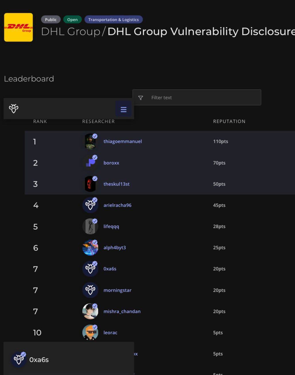 وعلى اثر ذلك قام الطالب بإبلاغ شركة DHL عن الثغرة عبر منصة Bug Bounty (Intigriti)، وتم قبول البلاغ، وتم إدراج اسم الطالب (اسم رمزي) ضمن قائمة الباحثين الأمنيين (leaderboard) الخاصة بالشركة كما هو موضح في الصورة المرفقة. وعادة يكون هناك تكريم مالي لمن يكتشف الثغرة. مبارك للكلية ولطالبنا المتميز.